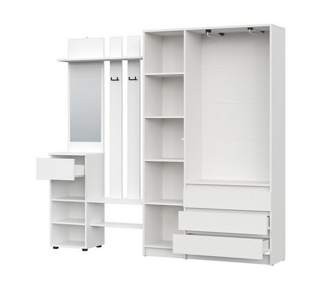 Комплект обеспечивает раздельное хранение для всех категорий вещей: от объемной одежды и обуви до аксессуаров и сезонных предметов, создавая при этом целостную и упорядоченную композицию.