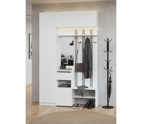 Включает вешалку с зеркалом, компактный верхний шкаф, вертикальный пенал и широкий навесной модуль.