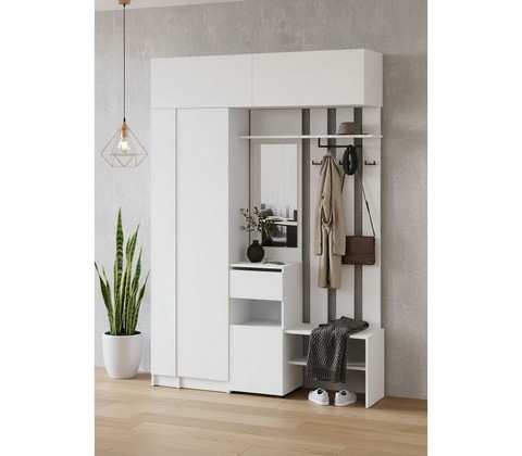 В комплектацию входит: вертикальный пенал для хранения, вешалка с зеркалом для ежедневного использования, угловой элемент для рационального использования пространства и два верхних шкафа для сезонных вещей.