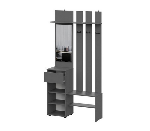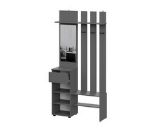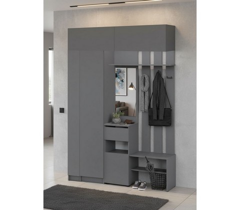 В комплектацию входит: вертикальный пенал для хранения, вешалка с зеркалом для ежедневного использования, угловой элемент для рационального использования пространства и два верхних шкафа для сезонных вещей.