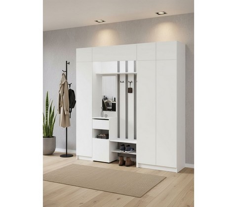 Комплект предлагает гибкую систему для размещения одежды, обуви, сумок и различных аксессуаров, эффективно используя как напольное, так и настенное пространство.