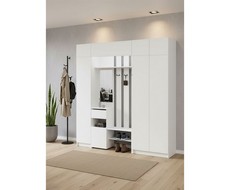 Включает вертикальный пенал, вешалку с зеркалом, двухстворчатый шкаф, широкий и стандартный навесные шкафы, а также компактный верхний модуль.