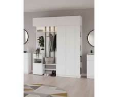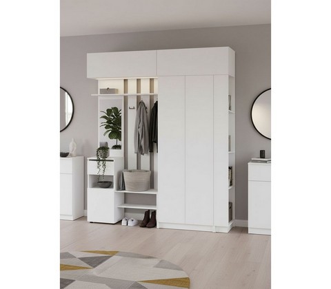 Комплект позволяет эффективно распределить верхнюю одежду и обувь в нижней зоне, разместить сезонные или редко используемые вещи наверху и рационально использовать угол, создавая при этом визуально легкую и упорядоченную композицию.