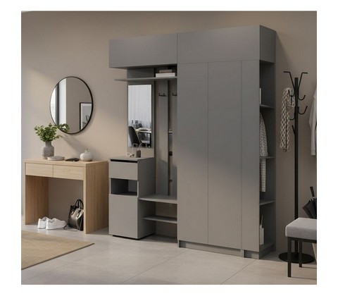 Комплект позволяет эффективно распределить верхнюю одежду и обувь в нижней зоне, разместить сезонные или редко используемые вещи наверху и рационально использовать угол, создавая при этом визуально легкую и упорядоченную композицию.