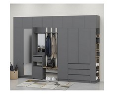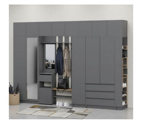 Комплект позволяет организовать раздельное хранение одежды, обуви, сумок и сезонных аксессуаров, создавая законченную и упорядоченную композицию благодаря угловому решению и модульности.