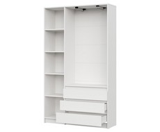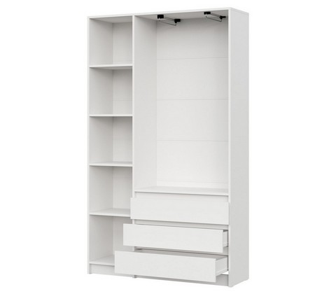 Шкафы оснащены распашными дверцами, а ящики вешалки и трехстворчатого шкафа — роликовыми направляющими.