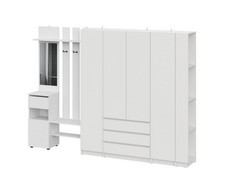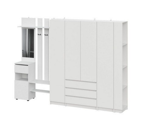 Включает вешалку с зеркалом, трехстворчатый шкаф, пенал, а также угловое завершение.