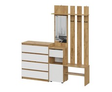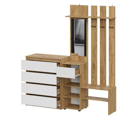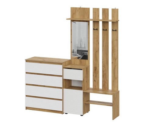 Включает вешалку с зеркалом и комод с четырьямя ящиками .