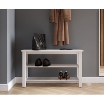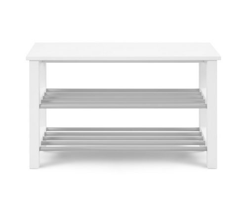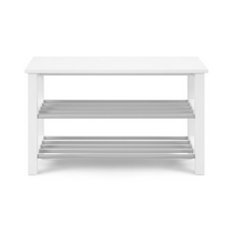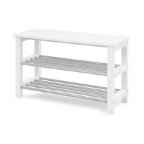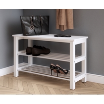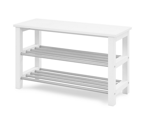 Обувница Мича с сиденьем сочетает прочность массива сосны и легкость металлических деталей.