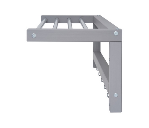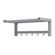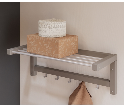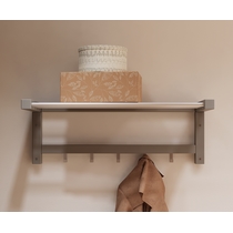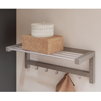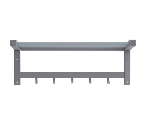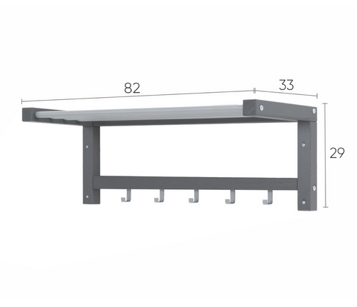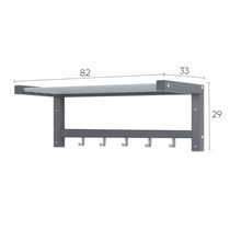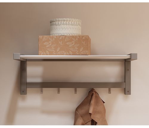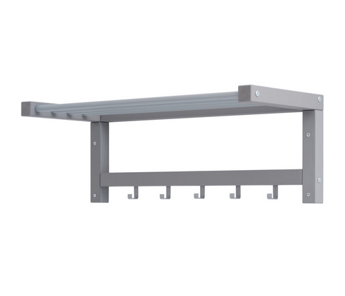 Вешалка Мича состоит из верхней полки выполненной из прочных металлических прутков для головных уборов и пяти металлических крючков для одежды и сумок.
