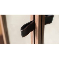 Один из зеркальных фасадов открывается за ручку-петлю из черной экокожи, второй фасад - за раму.