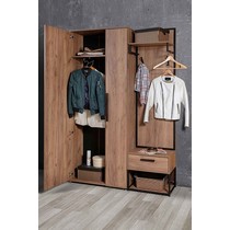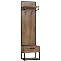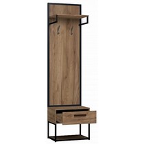 Открытая напольная вешалка с выдвижным ящиком, полкой для головных уборов и крючками имеет металлический каркас.