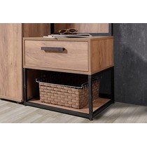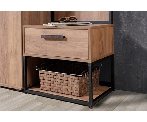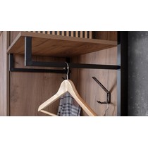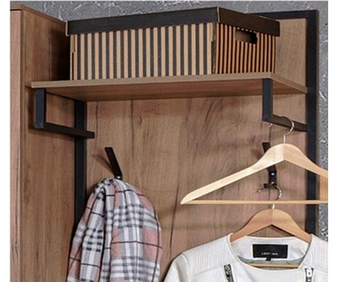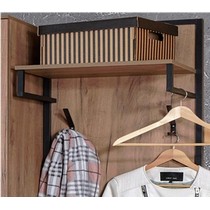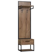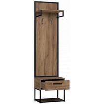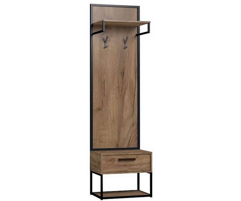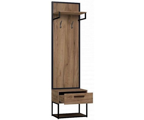 Открытая напольная вешалка с выдвижным ящиком, полкой для головных уборов, крючками крепится на стену за подвесы и имеет металлический каркас.