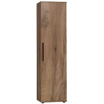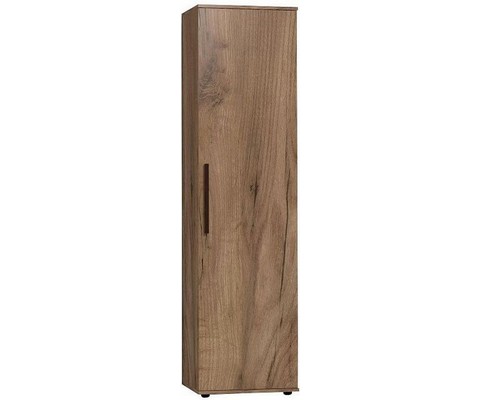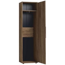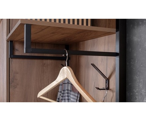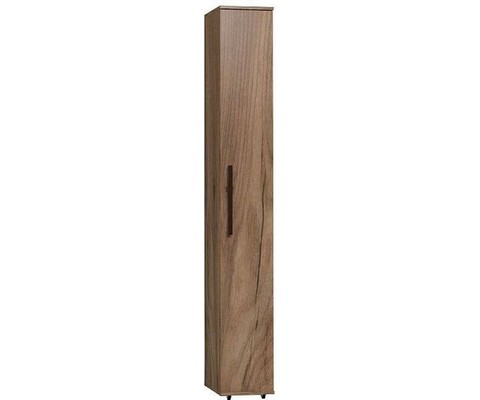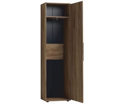 Распашной шкаф с одной дверкой комплектуется выдвижной штангой для вешалок и полкой.