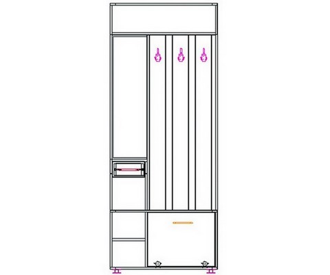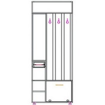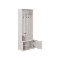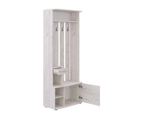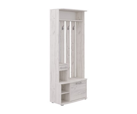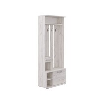 Оснащение: три сдвоенных крючка, распашной шкафчик с нишей, выдвижной ящик, зеркало, шесть открытых полок.