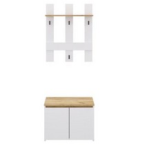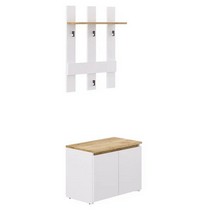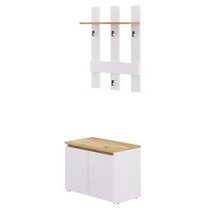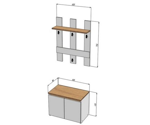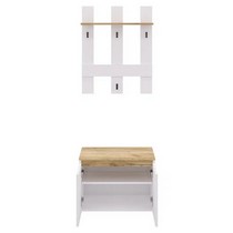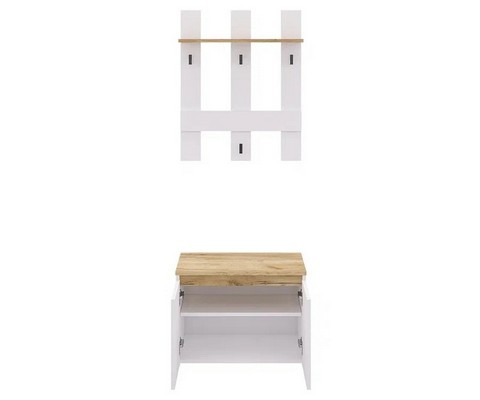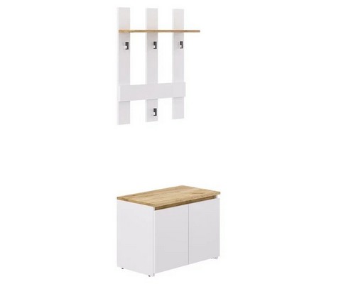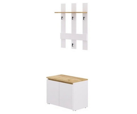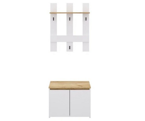 Прихожая ПР-16 белый крафт / золотой состоит из настенной вешалки и тумбы, которая является одновременно и обувницей.