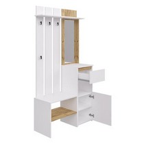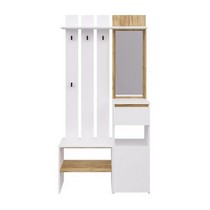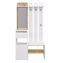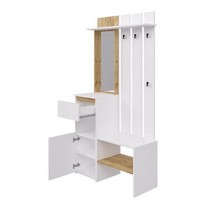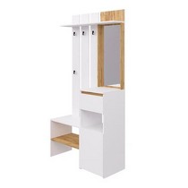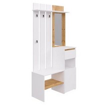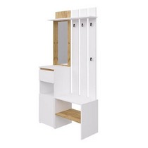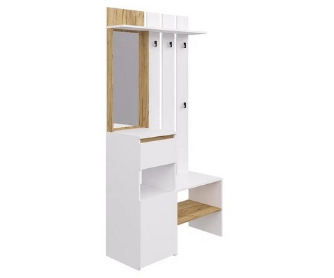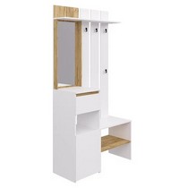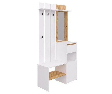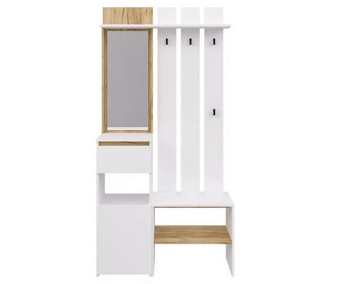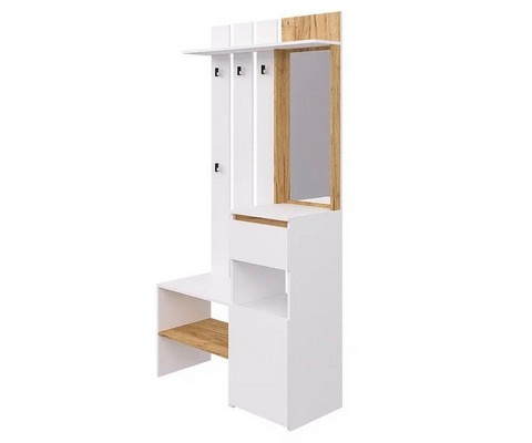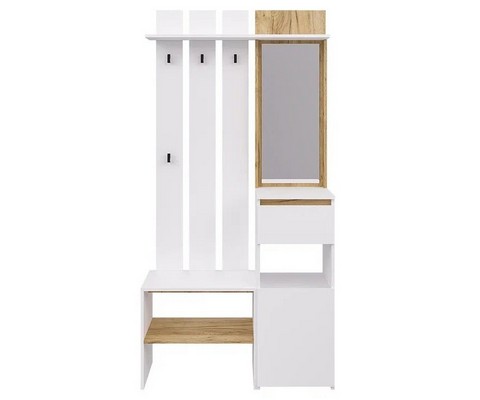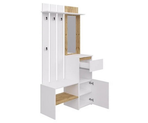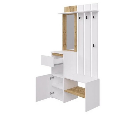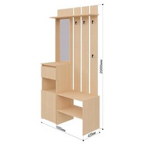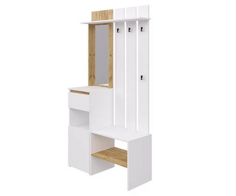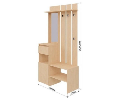 Конструкция состоит из настенной вешалки, открытой ниши с полкой, закрытой тумбы с полкой, выдвижного ящика, зеркала, четырех крючков.