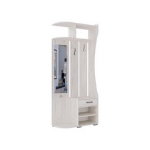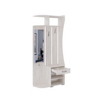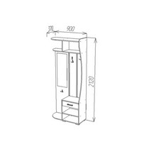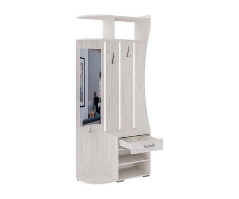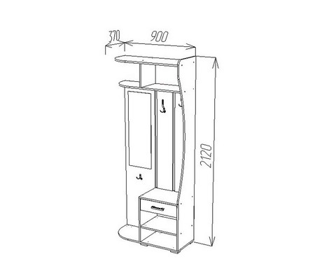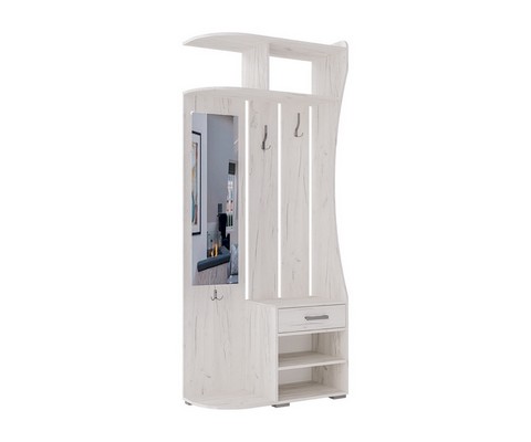 Оснащение: три сдвоенных крючка, четыре полки, две открытые ниши в нижней части конструкции, выдвижной ящик, зеркало.