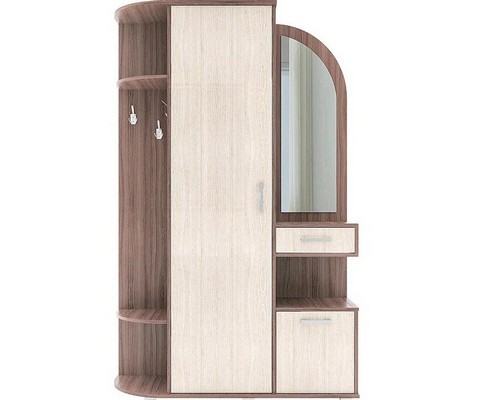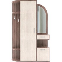 Прихожая ПР-4 ясень темный / светлый (прав.) имеет в оснащении 2 сдвоенных крючка, распашной шкаф-пенал для верхней одежды, глухой распашной шкафчик, зеркало.