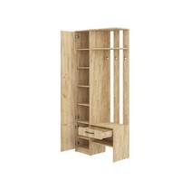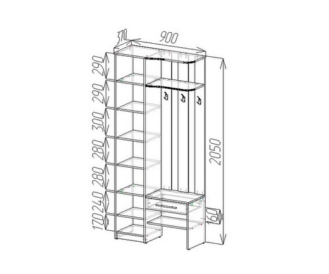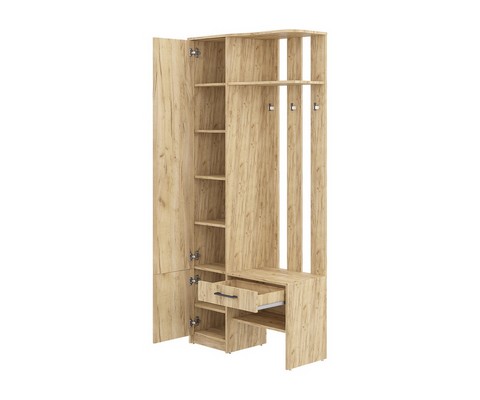 Оснащение: три сдвоенных крючка, две полки, две открытые ниши, выдвижной ящик, два распашных шкафчика на две и пять полок, зеркало.