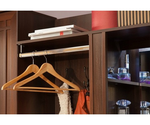 Внутри шкафа для одежды выдвижная штанга для вешалок и антресольная полка.