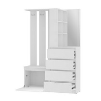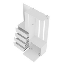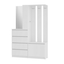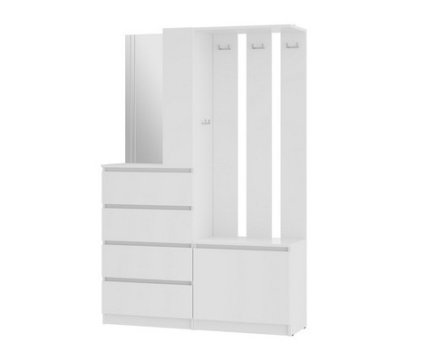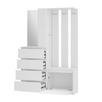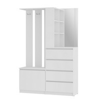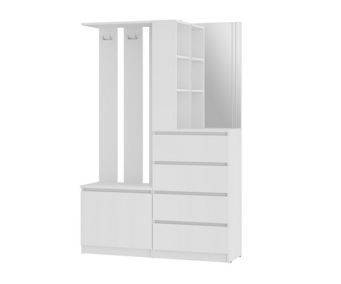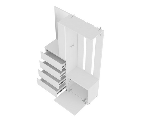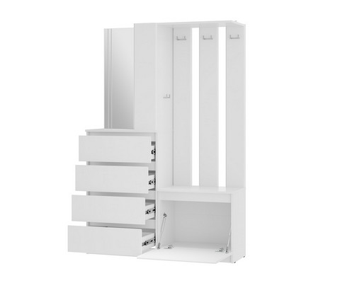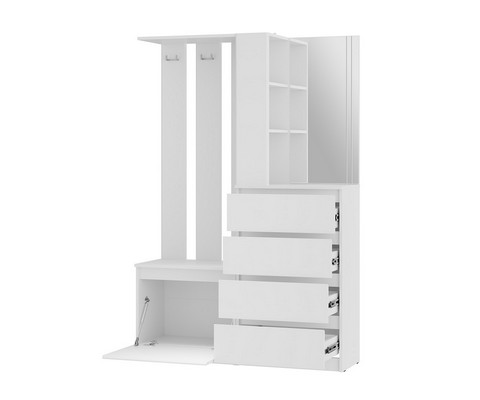 Модуль состоит из 4-х выдвижных ящиков, тумбы с откидной створкой, зеркала, открытых полок, надежных крючков для верхней одежды и верхней полки,