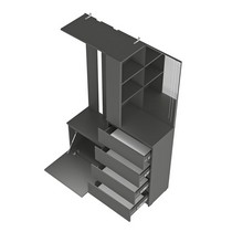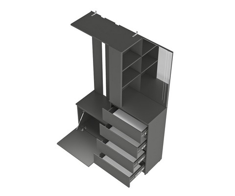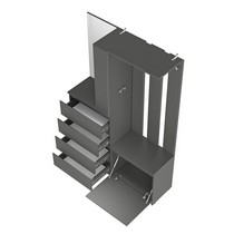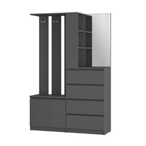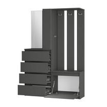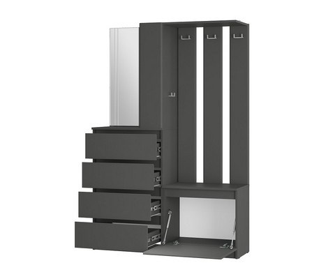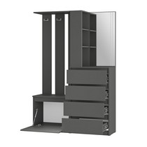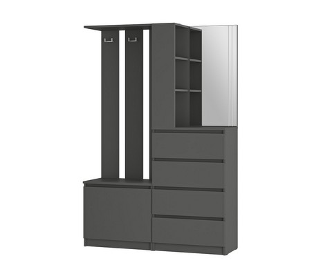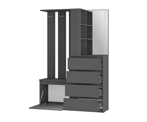 Модуль состоит из 4-х выдвижных ящиков, тумбы с откидной створкой, зеркала, открытых полок, надежных крючков для верхней одежды и верхней полки,