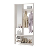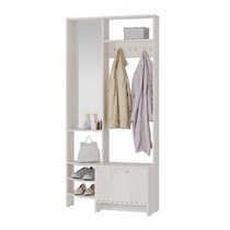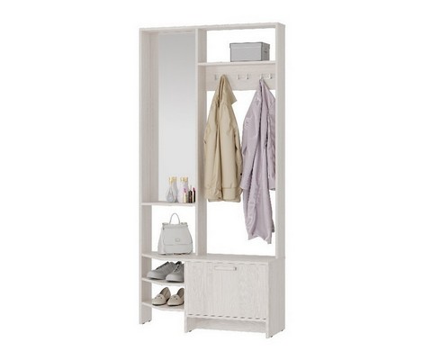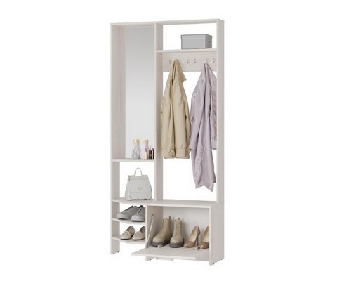 В комплект входит большое зеркало, открытая верхняя полка для головных уборов, крючки для верхней одежды, закрытая тумба-обувница и комплект полок для домашней обуви.