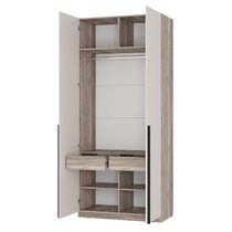 Двухстворчатый шкаф Урбан ШК-03 оснащен полками, выдвижными ящиками и вертикальным отсеком со штангой.