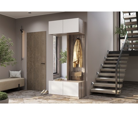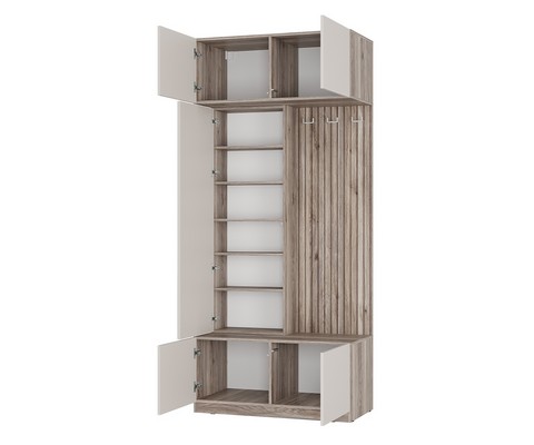Прихожая Урбан оснащена закрытыми полками для горизонтального хранения, что позволяет удобно размещать различные вещи.