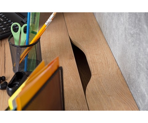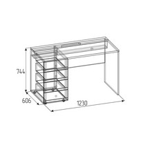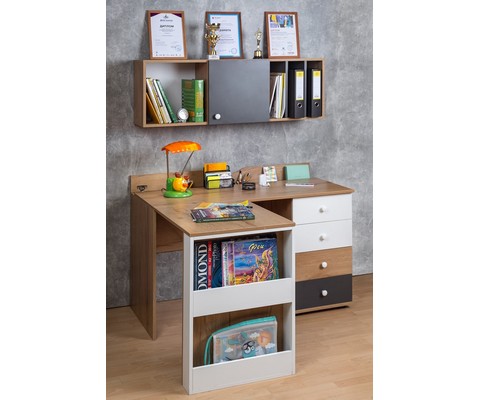 Комплект состоит из: письменного стола с 4-мя ящиками, углового приставного стола и навесной полки с закрытой нишей и открытыми секциями.