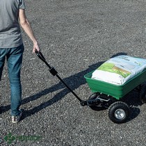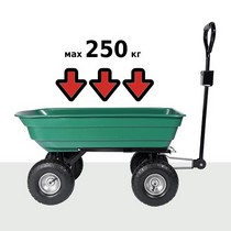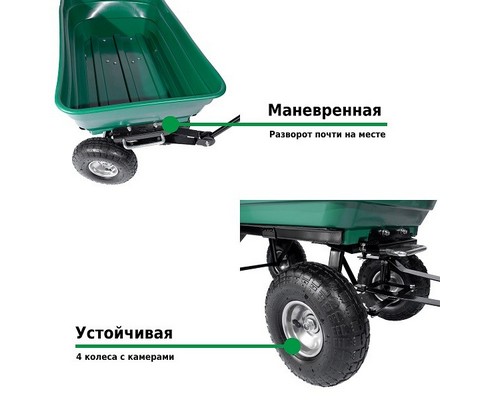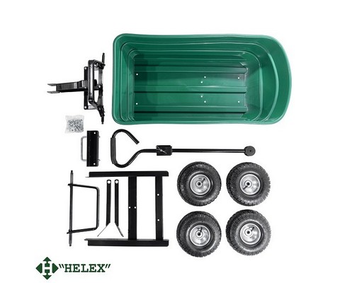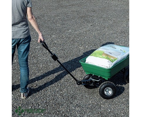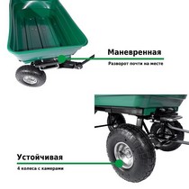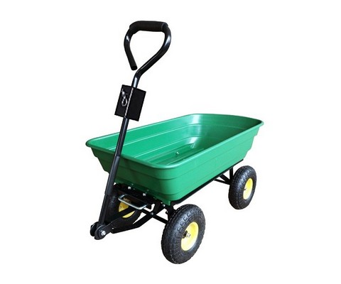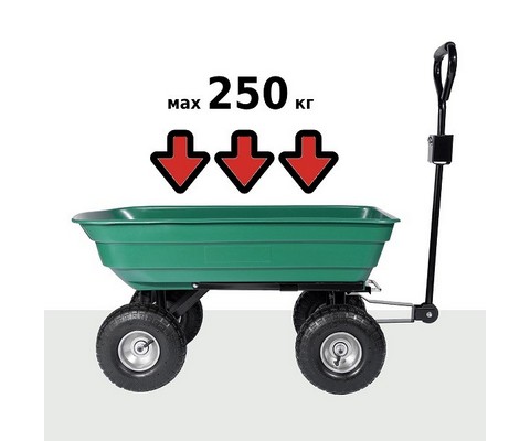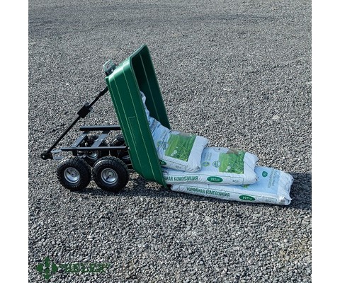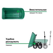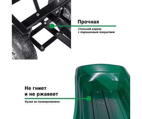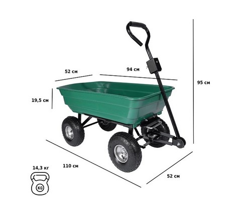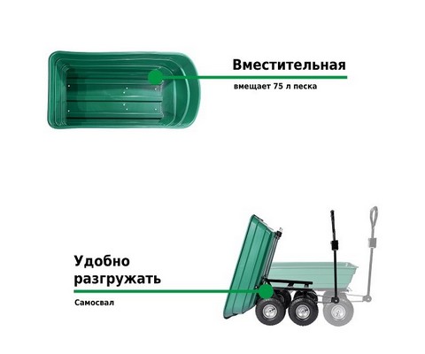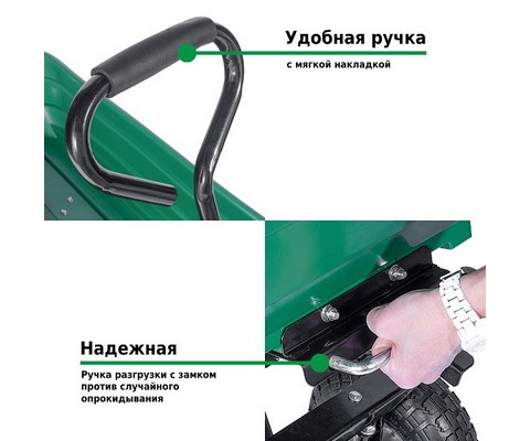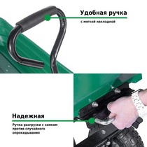 Садовая тележка-самосвал зеленая G201 имеет высокие пневматические колеса и удобную ручку с мягкой накладкой, что дает удобство при перевозке.