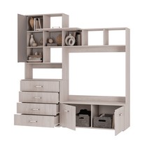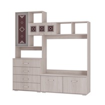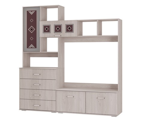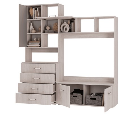 Центральная секция Белла состоит из комода, тумбы под телевизор, закрытых и открытых полок.