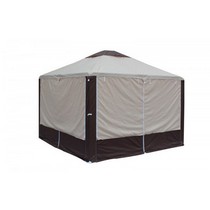 Тент крепится к каркасу стропами с пряжками и липучками, стенки сверху пришиты к тенту и крепятся к ножкам с помощью застежек-молний.