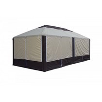 Тент крепится к каркасу стропами с пряжками и липучками, стенки сверху пришиты к тенту и крепятся к ножкам с помощью застежек-молний.