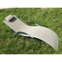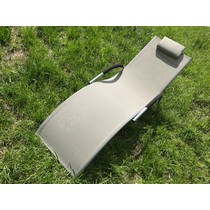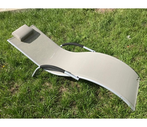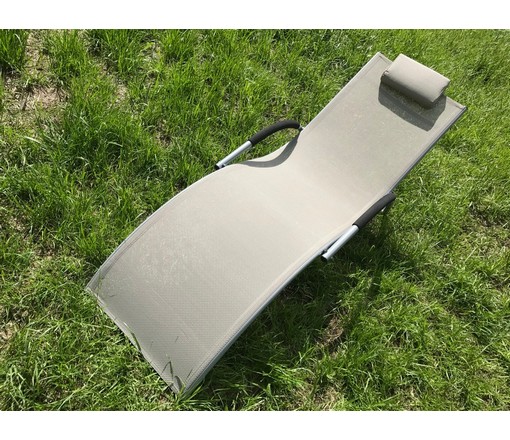 Лёгкий алюминиевый шезлонг с подлокотниками и подголовником.