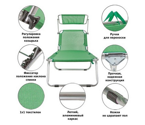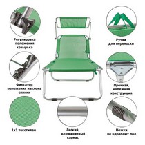 Лёгкий алюминиевый каркас устойчив к ржавчине и плесени, а материал сиденья и спинки - к воздействию ультрафиолетовых лучей.