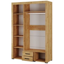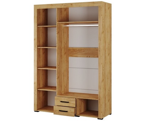 Шкаф оснащен полками, продольной штангой для вешалок и двумя выдвижными ящиками.