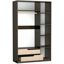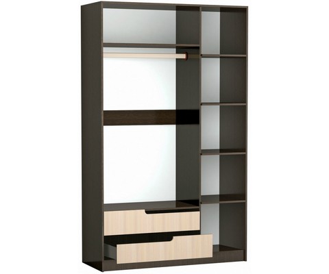 Шкаф оснащён тремя отделениями с распашными дверьми и двумя выдвижными ящиками.