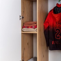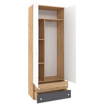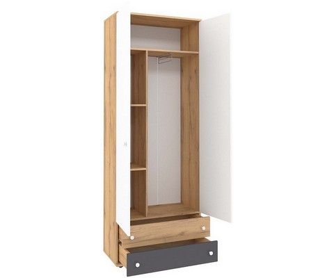 Шкаф для одежды и белья оснащен двумя выдвижными ящиками, стеллажом для одежды и выдвижной штангой для вешалок.