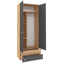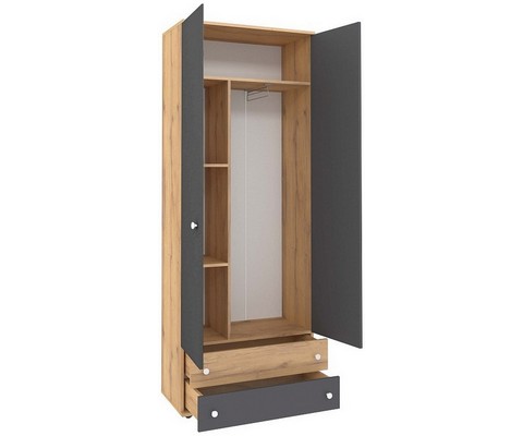 Шкаф для одежды и белья оснащен двумя выдвижными ящиками, стеллажом для одежды и выдвижной штангой для вешалок.