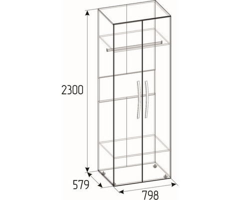 Шкаф комплектуется стационарной штангой, на которой можно разместить до 10 плечиков с верхней одеждой, а также двумя полками.