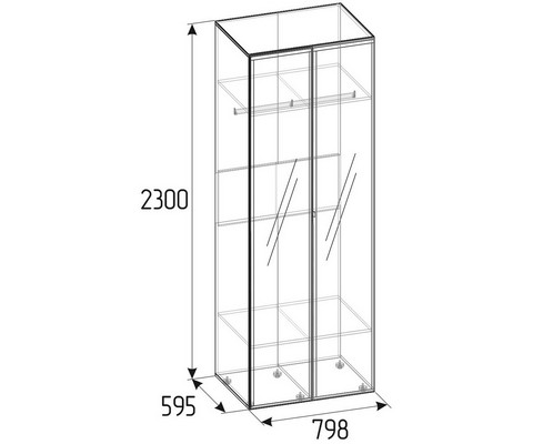 Шкаф комплектуется стационарной штангой, на которой можно разместить до 10 плечиков с верхней одеждой, а также двумя полками.