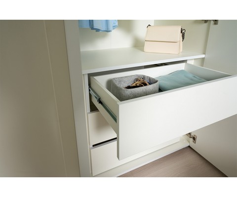 Шкаф для одежды Остин 13.336.02 оборудован антресольной полкой, отсеком со штангой для вешалок и тремя выдвижными ящиками.