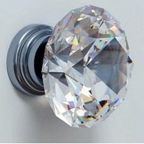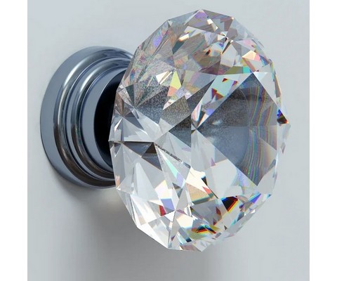 Все фасады коллекции оснащены ручками в виде ограненных кристаллов на хромированной ножке.
