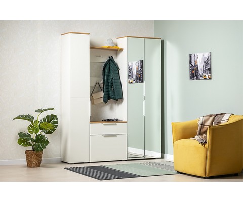 Створки шкафа оснащены зеркалом с минималистичными алюминиевыми ручками.