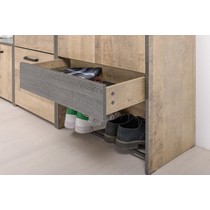 Шкаф выполнен в цвете дуб гранж песочный с контрастной кромкой в цвете интра.