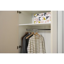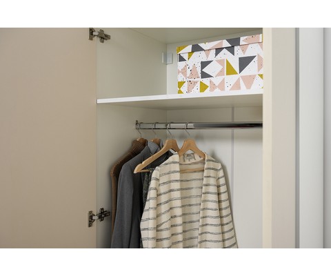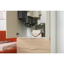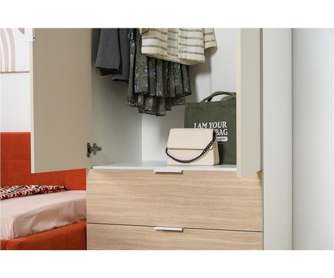 Двустворчатый распашной шкаф Марвэл 16.317.02 состоит из антресольной полки, секции со штангой для одежды на вешалках и двух выдвижных ящиков.
