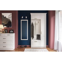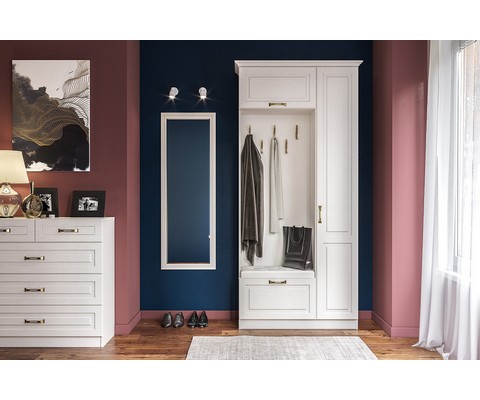 Открытая вешалка оснащена антресольной полкой для головных уборов и распашным отделением для обуви.