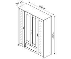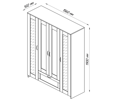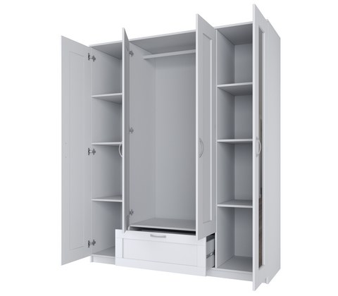 Шкаф для одежды четырехстворчатый, с одним выдвижным ящиком и двумя зеркалами.